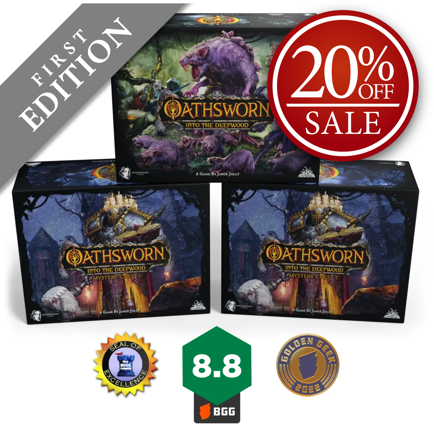 This contains all you need to play Oathsworn with all 21 chapters of the story, 27 Oathsworn Miniatures and over 70 large enemy miniatures hidden in mystery boxes.